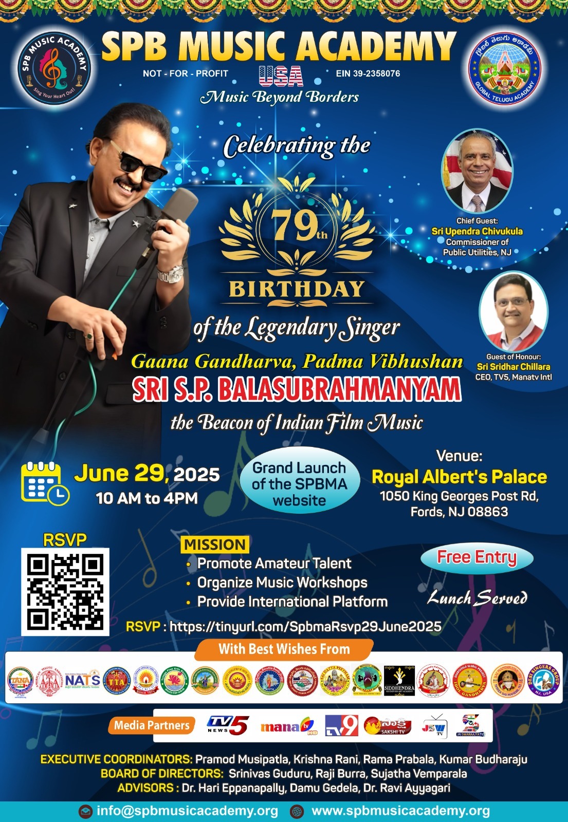 Home SPB మ్యూజిక్ అకాడమీ ఆవిర్భావాన్ని పురస్కరించుకుని ప్రఖ్యాత గాయకులు, పద్మవిభూషణ్ శ్రీ ఎస్.పి. బాలసుబ్రహ్మణ్యం గారి 79 వ జన్మదినాన్ని పురస్కరించుకొని, వేడుకలు జూన్ 29, 2025 న న్యూజర్సీ (New Jersey) లోని రాయల్ ఆల్బర్ట్ ప్యాలెస్ (Royal Albert’s Palace) వేదికగా ఘనంగా నిర్వహించబడ్డాయి. సన్నాయి కళాకారుల మంగళవాద్యాలు మ్రోగుతుండగా శ్రీ SP బాలసుబ్రమణ్యం గారి చిత్ర పటాన్ని, సగౌరవంగా, భక్తి ప్రపత్తులతో ఊరేగింపుగా హాలులోకి తీసుకువచ్చి, జ్యోతి ప్రజ్వలన చేసి పూలమాలలు […]